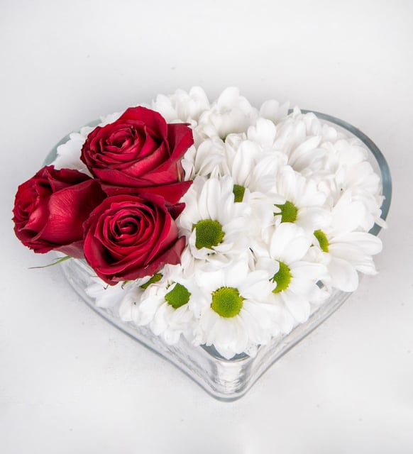 Kalp Camda Kırmızı Güller ve Papatyalar
